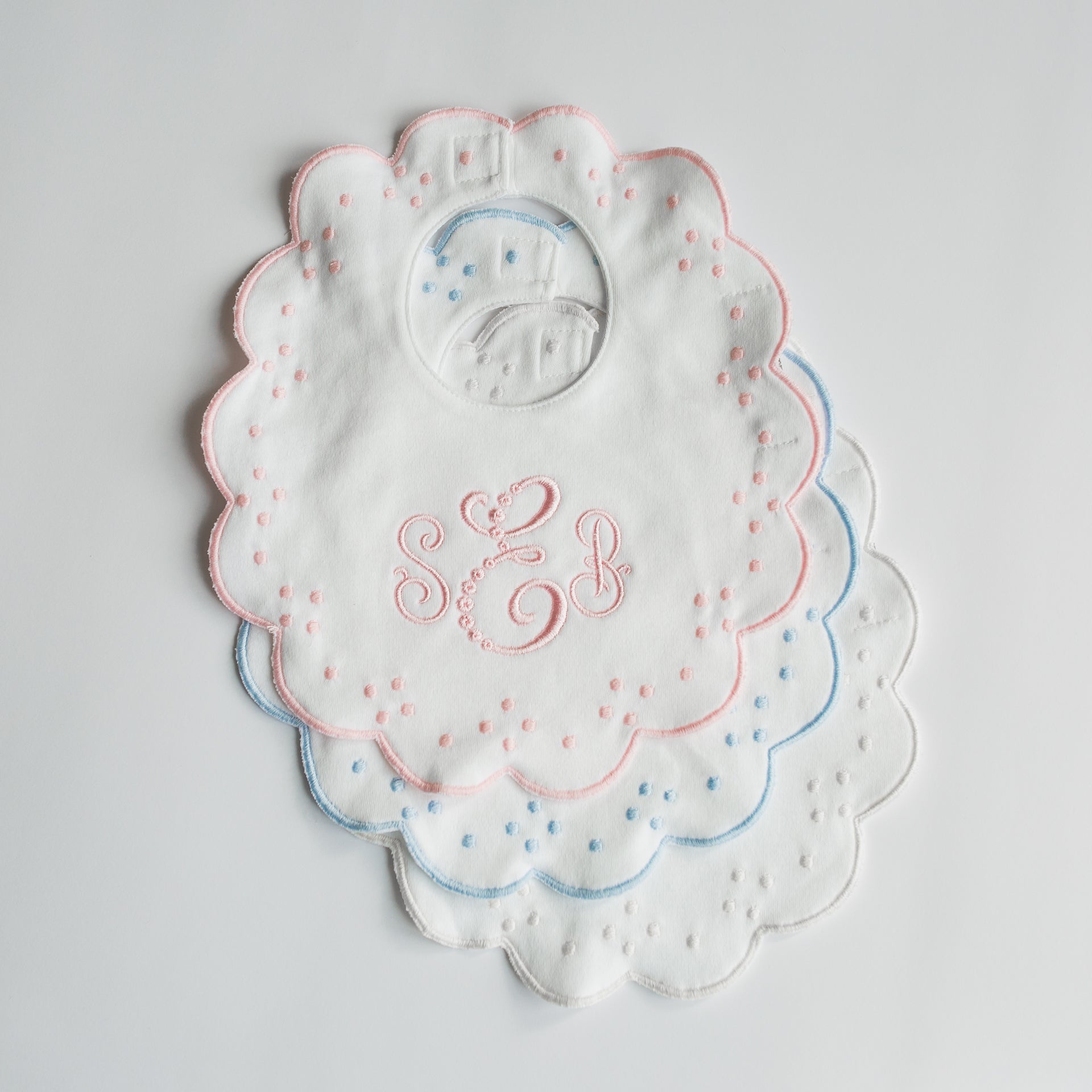 The Proper Peony Bib and Burp Set in Scalloped Dot is made of 100% cotton, double layered, with timeless hand-sewn embroidery. Bib and Burp is packaged with a satin bow and ready for gifting! Add a monogram too!