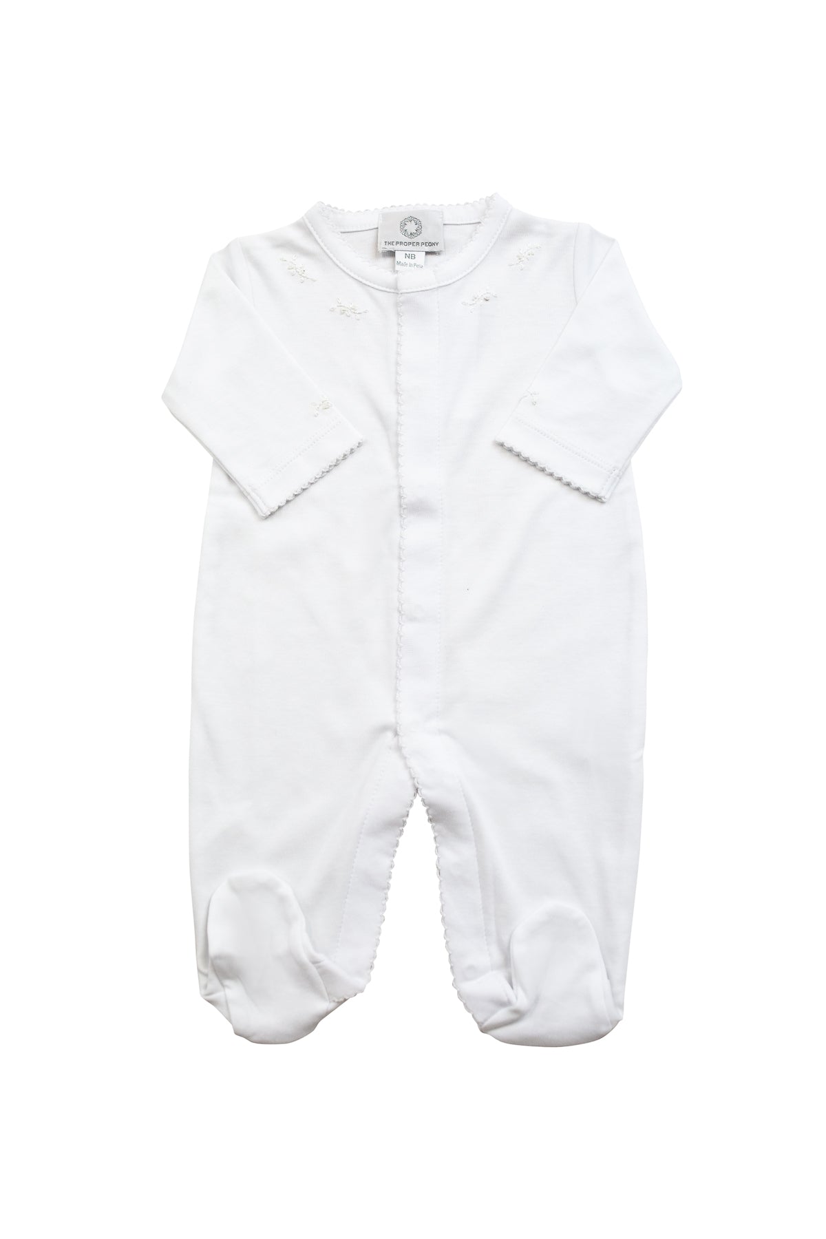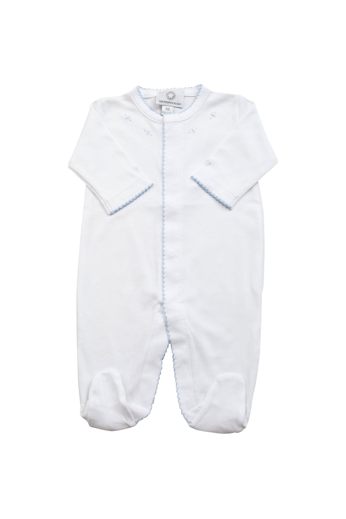 Made of the softest Pima cotton, our Footed Pajamas are perfect for both day and night. The delicate, simple embroidery makes this style a timeless classic. Perfectly coordinates with our full Proper Layette collection. All pajamas hand-embroidered with white, pink or blue accents. Gift wrap available at checkout. Available in nb, 3m and 6m.